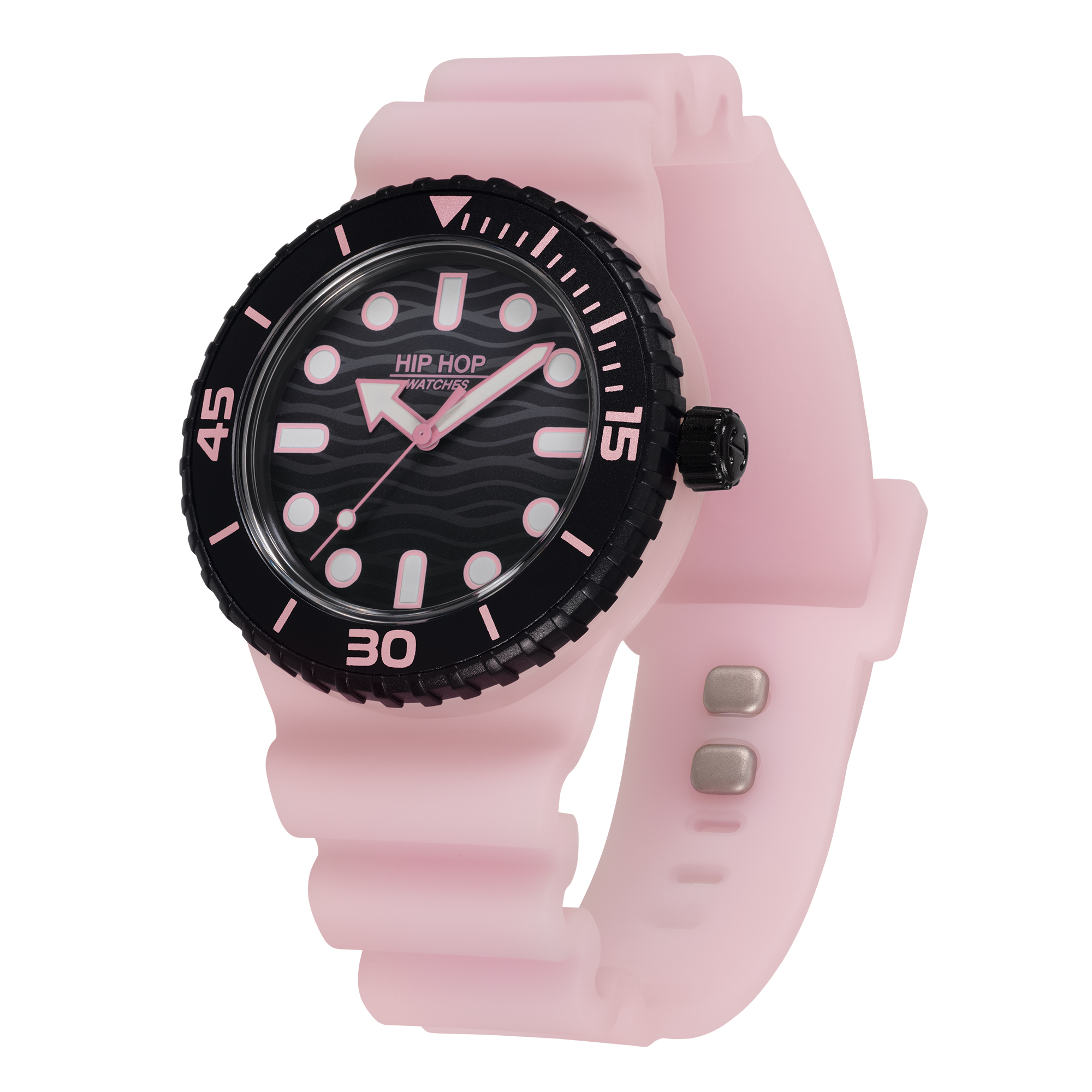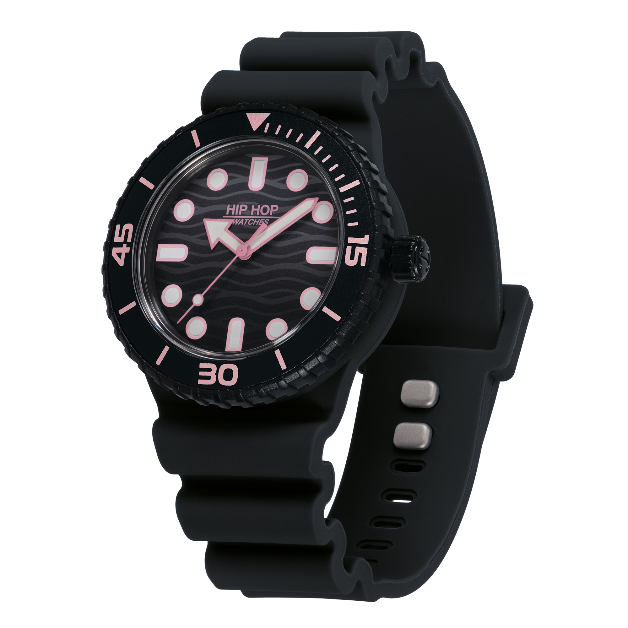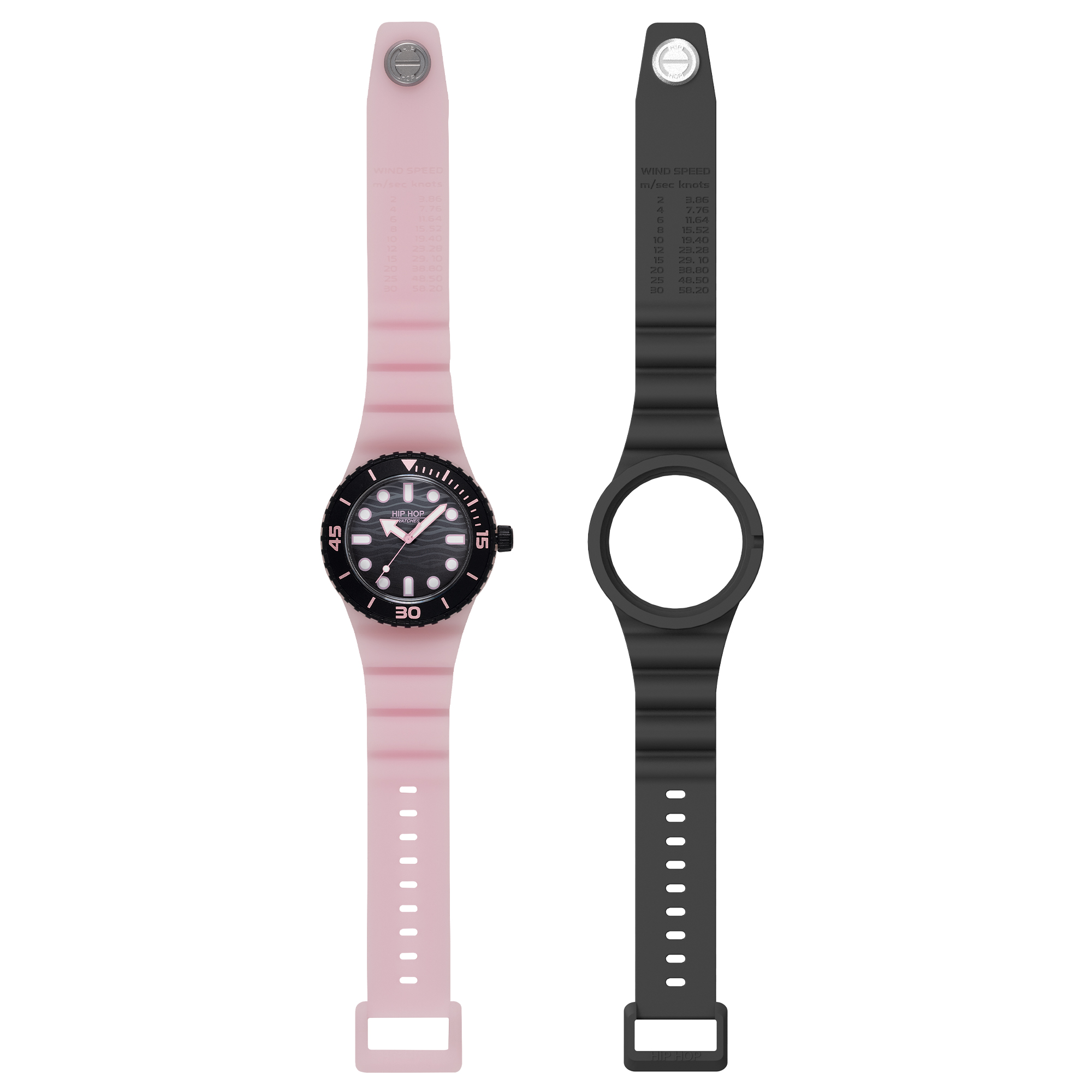 L’orologio Hip Hop Master è un mix perfetto di stile e praticità, adatto ad affrontare qualsiasi sfida quotidiana con energia e precisione. Il quadrante, dal pattern sfumato e ondulato sui toni del nero con dettagli rosa, è illuminato da indici e sfere con luminous rosa a contrasto. La lunetta girevole unidirezionale color nero è in alluminio, per un accostamento di carattere e stile. Il morbido cinturino in silicone semitrasparente rosa ha la chiusura .DOT e ha impresso un dettaglio speciale: la Wind Speed, scala di conversione da metri al secondo a nodi per indicare la velocità del vento. L’orologio è venduto con un secondo cinturino intercambiabile in silicone color nero per essere sempre intonati con il mood della giornata.